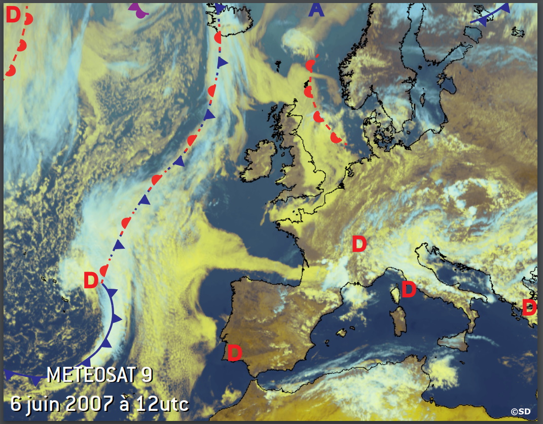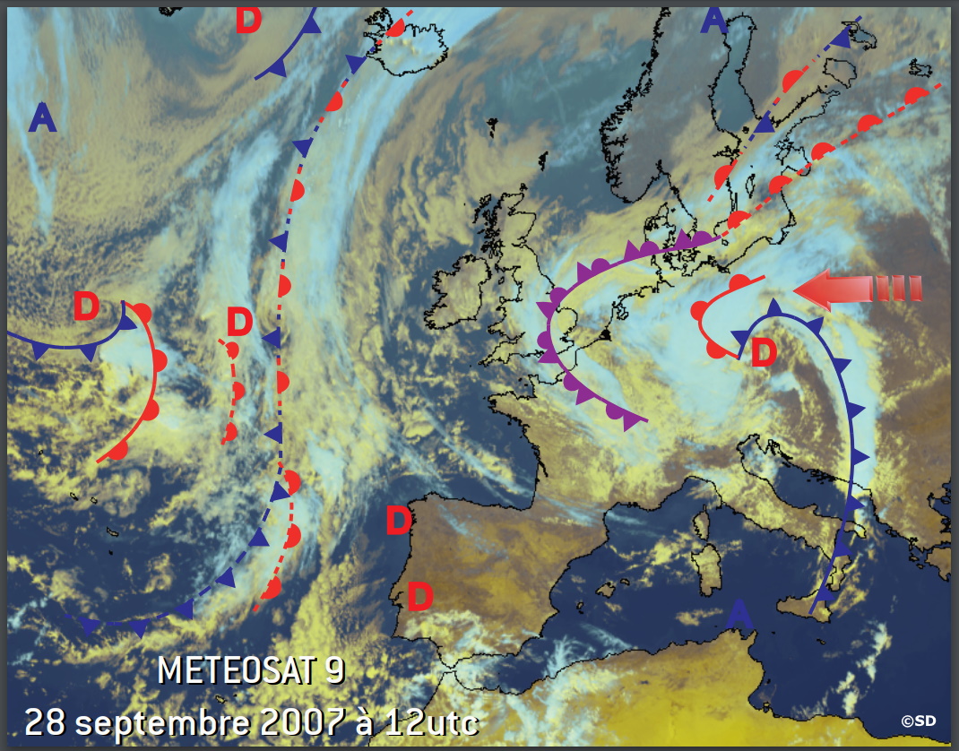 Un des 3 grands régimes perturbés (chacun des 3 premiers représentant autour d’1/3 du total). Le plus vicieux sans doute, un casse-tête du prévisionniste tant il est habile en contre-pieds, autant pour la chronologie que pour l'intensité des phénomènes. Il faut y voir beaucoup l’influence de la chaleur qui remonte de régions lointaines (au large du Maroc, du Sahara, de la Péninsule ibérique...), accompagnée d’humidité océanique, donc d’un fort potentiel d’instabilité.